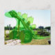 A happy green cartoon stegosaurus sitting on the ground staring up at the sky to the left of the frame superimposed over the top of a photo of an old machine with large wheels, forming a "skeleton" for the dinosaur.