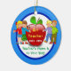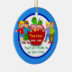 Super Cute inexpensive 2 Sided Teacher Ornaments Personalised with 2 text box templates to type in the YEAR or YEARS, Teacher's NAME and or YOUR TEXT or just Delete the temporary text. Great for elementary teacher gifts. Boys and girls showing off "A+ Teacher" gifts. Big apple on the back of these teacher ornaments.