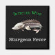 Tying into a monster sturgeon is an experience of a lifetime. Catch one and you are hooked. Full colour life like image of a giant sturgeon with the text Infected With Sturgeon Fever in the background. Available in many colours.