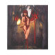 A seductive demoness stands in a shadowy forest, her fiery wings spread wide as she wields a glowing flame and a crimson trident. Clad in dark red, she exudes power, danger, and dark enchantment.