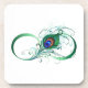 The symbol of infinity with a bright, green, artistic peacock feather on a white background. Tattoo style.