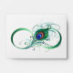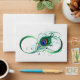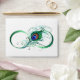 The symbol of infinity with a bright, green, artistic peacock feather on a white background. Tattoo style.