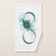 The symbol of infinity with a bright, green, artistic peacock feather on a white background. Tattoo style.