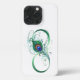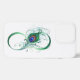 The symbol of infinity with a bright, green, artistic peacock feather on a white background. Tattoo style.