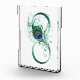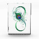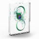 The symbol of infinity with a bright, green, artistic peacock feather on a white background. Tattoo style.