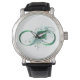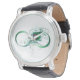 The symbol of infinity with a bright, green, artistic peacock feather on a white background. Tattoo style.