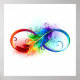Artistically drawn infinity symbol with beautiful rainbow feather on white background. Tattoo style.