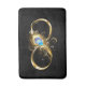 Gold, shiny symbol of infinity, decorated with jewellery peacock feather with turquoise on black background.