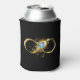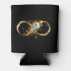 Gold, shiny symbol of infinity, decorated with jewellery peacock feather with turquoise on black background.