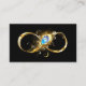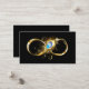 Gold, shiny symbol of infinity, decorated with jewellery peacock feather with turquoise on black background.