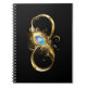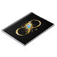 Gold, shiny symbol of infinity, decorated with jewellery peacock feather with turquoise on black background.
