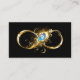 Gold, shiny symbol of infinity, decorated with jewellery peacock feather with turquoise on black background.