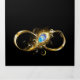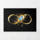 Gold, shiny symbol of infinity, decorated with jewellery peacock feather with turquoise on black background.