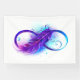 Infinity symbol with a beautiful feather painted in purple and blue bright colours on white background.