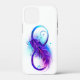 Infinity symbol with a beautiful feather painted in purple and blue bright colours on white background.