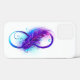 Infinity symbol with a beautiful feather painted in purple and blue bright colours on white background.