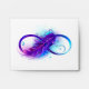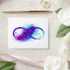 Infinity symbol with a beautiful feather painted in purple and blue bright colours on white background.