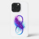 Infinity symbol with a beautiful feather painted in purple and blue bright colours on white background.