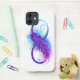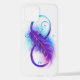 Infinity symbol with a beautiful feather painted in purple and blue bright colours on white background.