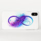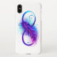 Infinity symbol with a beautiful feather painted in purple and blue bright colours on white background.