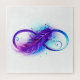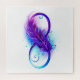Infinity symbol with a beautiful feather painted in purple and blue bright colours on white background.