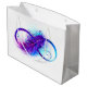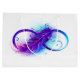 Infinity symbol with a beautiful feather painted in purple and blue bright colours on white background.