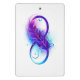 Infinity symbol with a beautiful feather painted in purple and blue bright colours on white background.