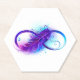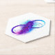 Infinity symbol with a beautiful feather painted in purple and blue bright colours on white background.