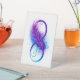 Infinity symbol with a beautiful feather painted in purple and blue bright colours on white background.