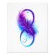 Infinity symbol with a beautiful feather painted in purple and blue bright colours on white background.