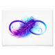 Infinity symbol with a beautiful feather painted in purple and blue bright colours on white background.