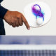 Infinity symbol with a beautiful feather painted in purple and blue bright colours on white background.