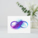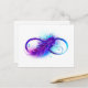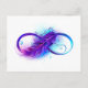 Infinity symbol with a beautiful feather painted in purple and blue bright colours on white background.