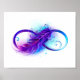 Infinity symbol with a beautiful feather painted in purple and blue bright colours on white background.