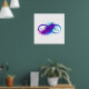 Infinity symbol with a beautiful feather painted in purple and blue bright colours on white background.