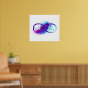 Infinity symbol with a beautiful feather painted in purple and blue bright colours on white background.