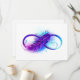 Infinity symbol with a beautiful feather painted in purple and blue bright colours on white background.