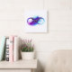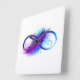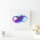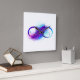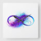 Infinity symbol with a beautiful feather painted in purple and blue bright colors on white background.