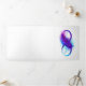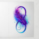 Infinity symbol with a beautiful feather painted in purple and blue bright colours on white background.