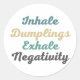 Sweet up your life and spread positivity with these "Inhale Dumplings Exhale Negativity" stickers! Featuring a bold, inspiring typography, these stickers are perfect for adding some personality to your notebook, laptop, water bottle, or anything in between. Each sticker is made from durable vinyl material and has a smooth, non-glossy finish that resists water, sunlight, and scratches, so you can enjoy them for years to come. Whether you're a fan of dumplings or just want to remind yourself and others to let go of negativity, these stickers are a fun and uplifting addition to any collection.