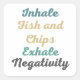 Sweet up your life and spread positivity with these "Inhale Fish and Chips Exhale Negativity" stickers! Featuring a bold, inspiring typography, these stickers are perfect for adding some personality to your notebook, laptop, water bottle, or anything in between. Each sticker is made from durable vinyl material and has a smooth, non-glossy finish that resists water, sunlight, and scratches, so you can enjoy them for years to come. Whether you're a fan of fish and chips or just want to remind yourself and others to let go of negativity, these stickers are a fun and uplifting addition to any collection.