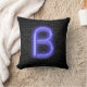Initial B in glowing marquee purple neon lighting on urban city brick wall.