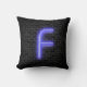 Initial F in glowing marquee purple neon lighting on urban city brick wall.