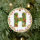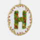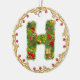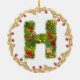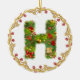 initial H monogrammed christmas ornament - circle/ This exquisite letter H christmas tree decoration will give your xmas a traditional touch with a modern personalised feel. Designed to look like a fir tree covered with presents and gifts this letter a on a circular ornament is surounded by a gold frame with red berries. Upmarket and on trend this is an affordable luxury for you holiday decor needs. Double sided for extra impact this green and red image on a snowy white background is a favourite with businesses also. Full alphabet available.