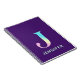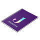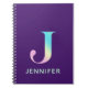 Chic personalised purple notebook with a "J" monogram initial in large bold typography with a pink, yellow, mint green and teal blue rainbow gradient. Add your name below in simple pink typography.