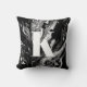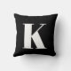 Simple, stylish custom initial letter monogram throw pillow with a black and white ink marble swirl pattern on the front, solid black back and modern minimalist typography in white. this personalised pillow makes the perfect customised gift and thoughtful home decor accessory.