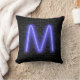 Initial M in glowing marquee purple neon lighting on urban city brick wall.