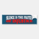 Silence is the protein of injustice, reads this bumper sticker, tailored for the activist who knows the preservation of democracy depends heavily on protest and vocal participation. This quote was inspired by the ongoing need for private citizens to address certain political issues such as global warming, women's rights, civil rights, abortion, racism, etc., tied to government policy by marching, activism, boycotts, voter participation and other responses.