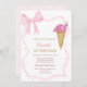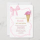 This first birthday invitation with watercolor pink bow, ice cream with pink flamingo and striped background.