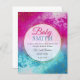 A budget baby shower or gender reveal invitation. On a blue and pink ink splash background, a white transparent circle, surrounded by gold rings and glitter, contains the baby's surname within typography text. Personalize by adding your full event and contact details to the front and back.